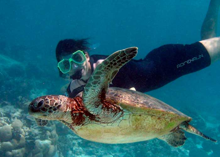 En León Dormido se realiza snorkeling para observa los tiburones martillos, tiburón Galápagos, rayas águilas, rayas doradas, tortugas marinas y peces.